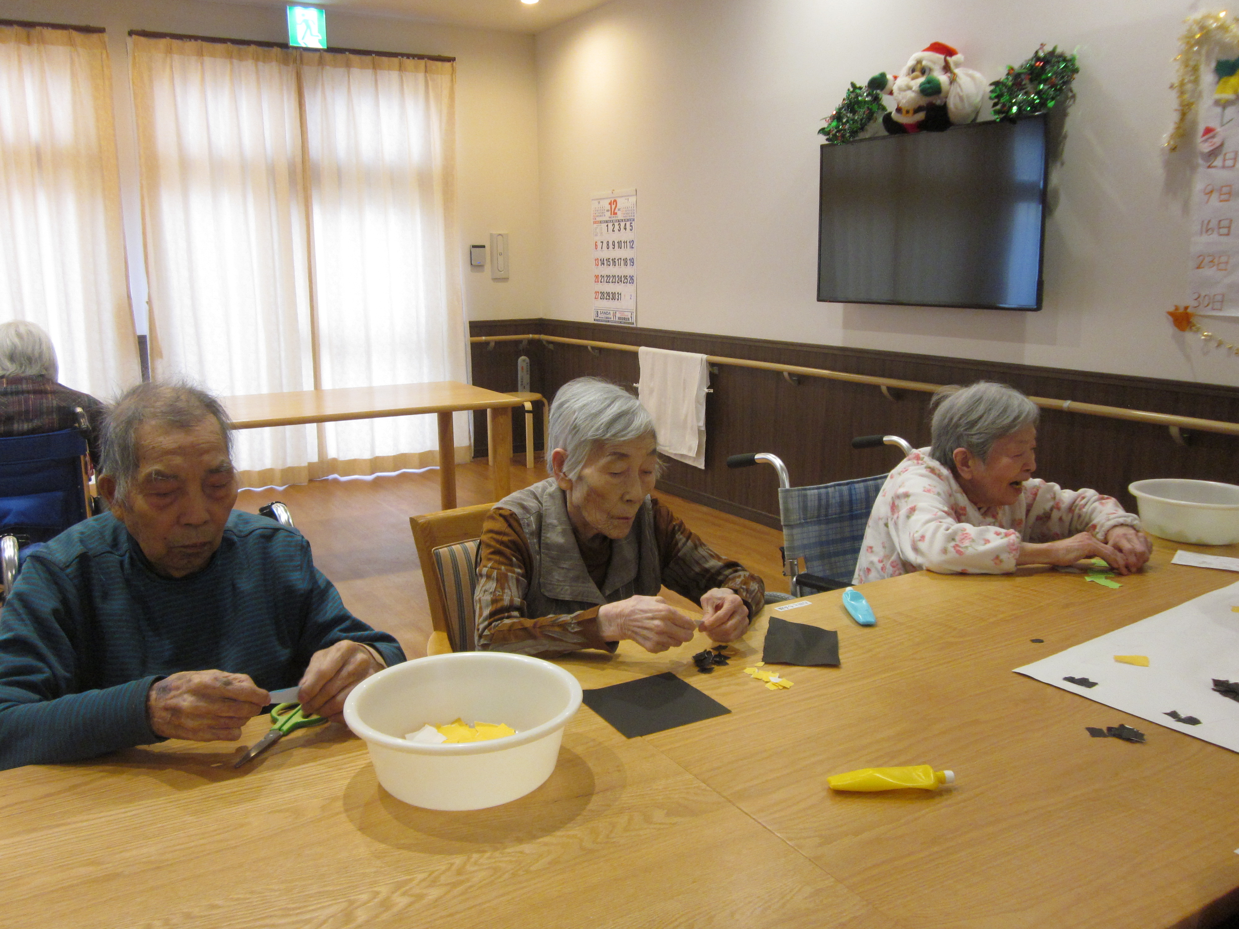 黙々と作業に集中する方、「これはここに貼るんかね~?」等と職員に質問しながら貼る方、また入所者同士で会話を楽しみながら作業される方もみえ、参加者様全員が楽しみながら行えたようで、職員も嬉しく感じました♪